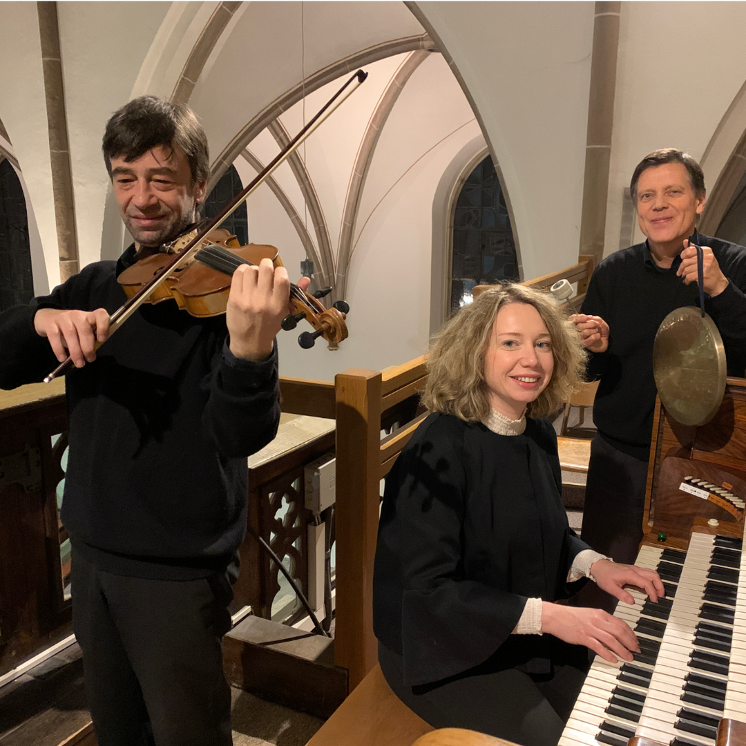 Es musizieren Olga Shonurova (Orgel und Schlaginstrumente), Benjamin Nachbar (Violine) und Günther Wiesemann (Orgel und Schlaginstrumente, Sprecher).